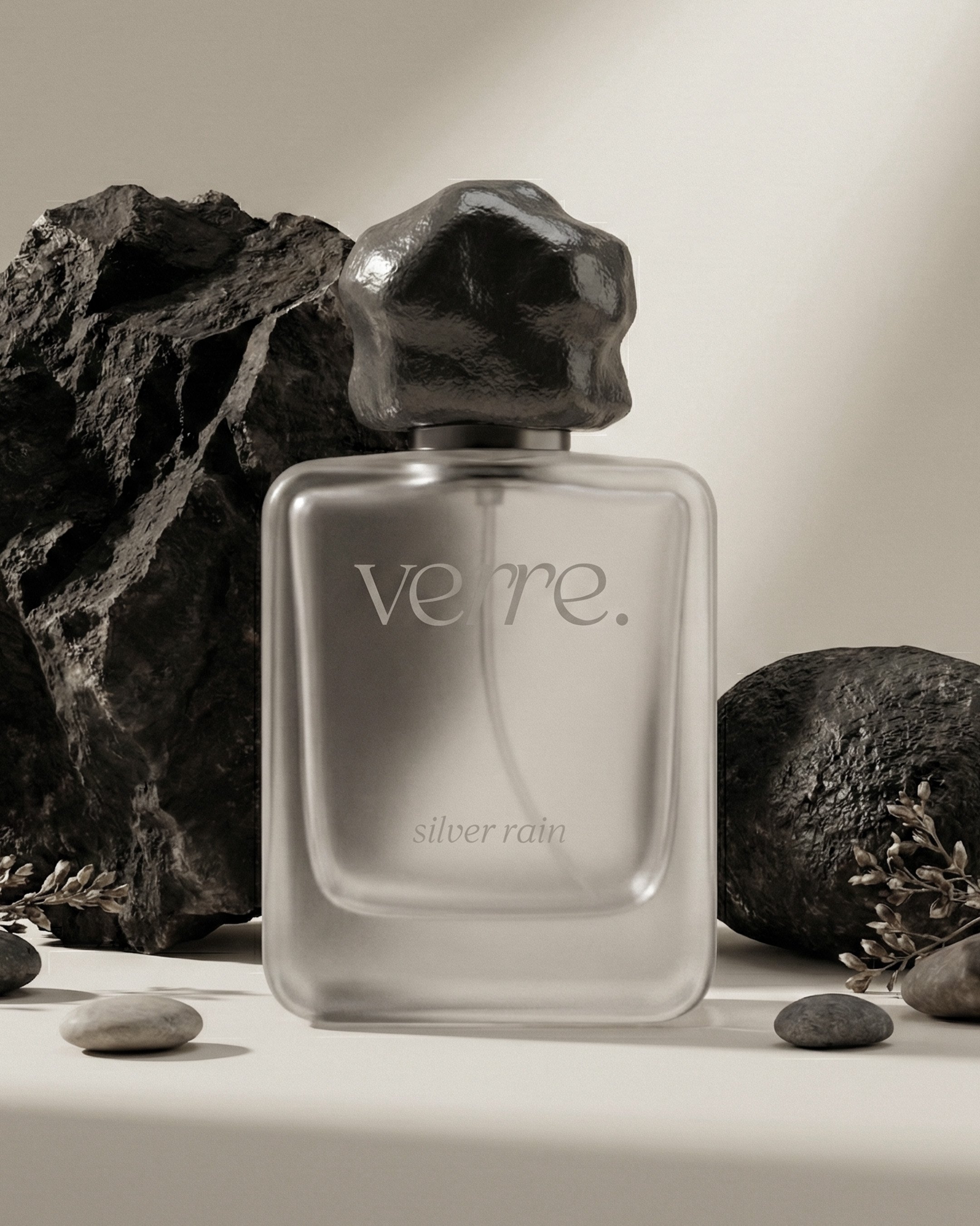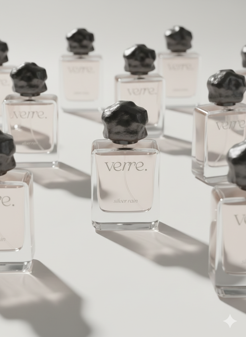 Verre. to koncepcyjna marka perfum z segmentu mid-range premium, inspirowana ideą cichego luksusu, przejrzystości i prostoty formy. Nazwa, pochodząca z języka francuskiego i oznaczająca „szkło”, stała się punktem wyjścia do stworzenia identyfikacji wizualnej opartej na świetle, strukturze i subtelnych refleksach.